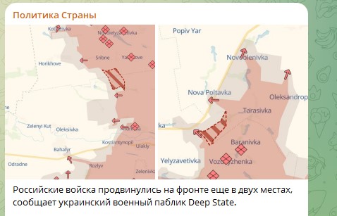 По данным украинских мониторинговых ресурсов, армия России продвинулась на фронте ещё в двух местах. Как сообщает украинский военный паблик Deep State, продвижения есть на Новопавловском направлении южнее Серебряного, а также к югу от Константиновки - в районе Водяного 2-го.