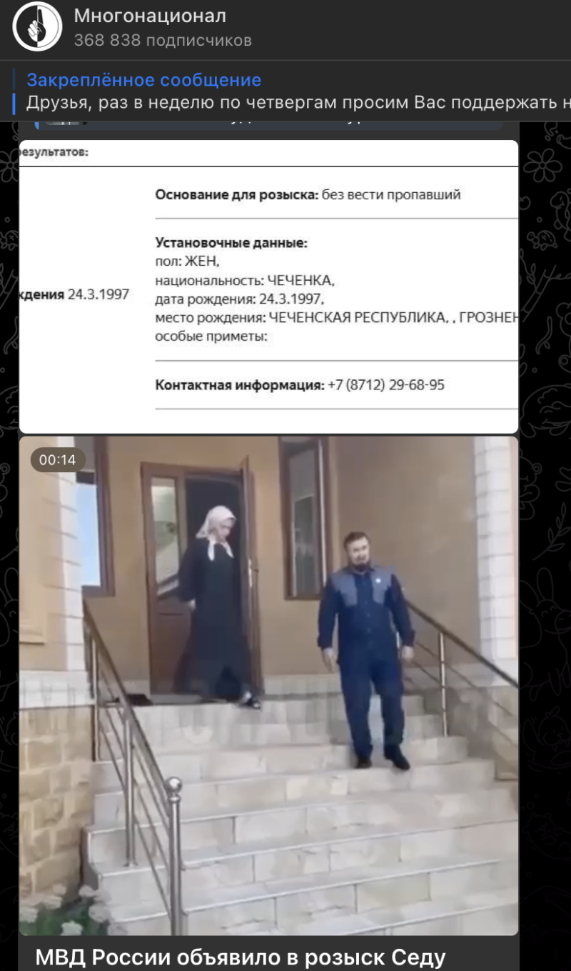 Тем временем телеграм-канал "Многонационал" сообщает, что МВД России объявило в розыск Седу Сулейманову, уроженку Чечни, которая в 2023 году была насильно увезена из Санкт-Петербурга в Грозный. В официальной карточке базы розыска указано, что девушку ищут как без вести пропавшую