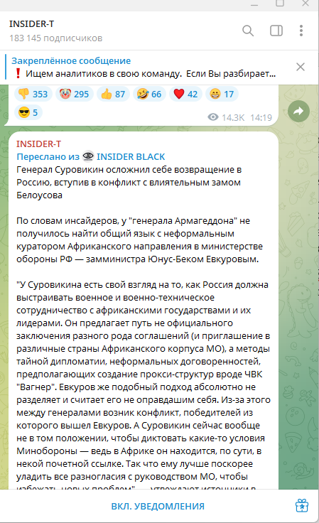 "У Суровикина есть свой взгляд на то, как Россия должна выстраивать военное и военно-техническое сотрудничество с африканскими государствами и их лидерами. Он предлагает путь не официального заключения разного рода соглашений (и приглашение в различные страны Африканского корпуса МО), а методы тайной дипломатии, неформальных договорённостей, предполагающих создание прокси-структур вроде ЧВК "Вагнер". Евкуров же подобный подход абсолютно не разделяет и считает его не оправдавшим себя".