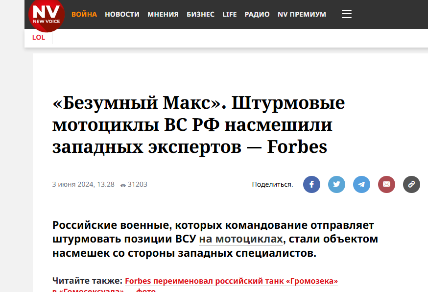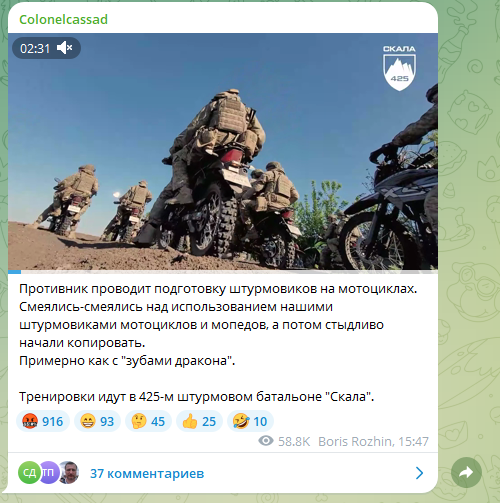 Украинцам сперва было очень смешно. Они наперебой делились снятыми дронами на поле боя роликами, на которых и были запечатлены русские бойцы на "мотиках". Насмешки перемежались с традиционной украинской пропагандой на тему, что у русских всё плохо (ракеты кончаются, потери нереальные и т. д.).
