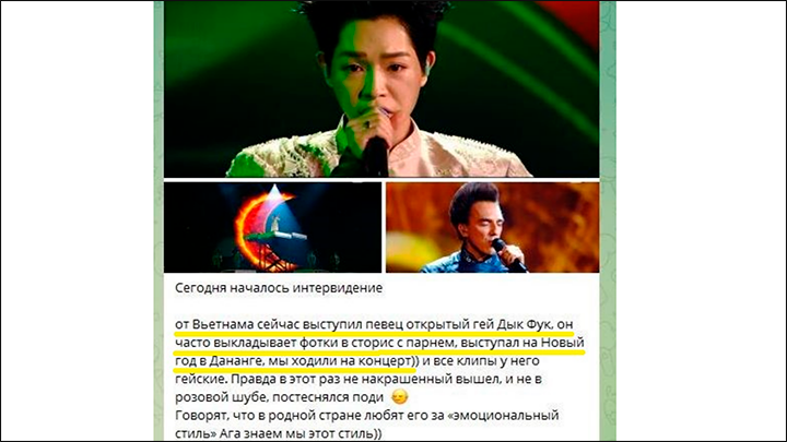 Победа вьетнамского певца Нгуена Дык Фука на недавно завершившемся в Москве конкурсе "Интервидение" вызвала бурную реакцию в соцсетях и медиа. Особый интерес к победителю проявили не только одиночные либеральные активисты, но и целые русофобские телеграм-ресурсы с большой аудиторией. Среди таких - крупные каналы, связанные с группой СМИ, ассоциирующихся с беглым олигархом Михаилом Ходорковским**.