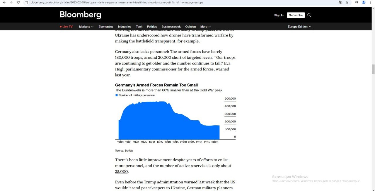 Учитывая масштабное разоружение Германии за последние десятилетия и нынешнюю скорость закупок, мы обнаруживаем, что по некоторым ключевым системам вооружений Германия не достигнет уровня боеспособности 2004 года даже за 100 лет.