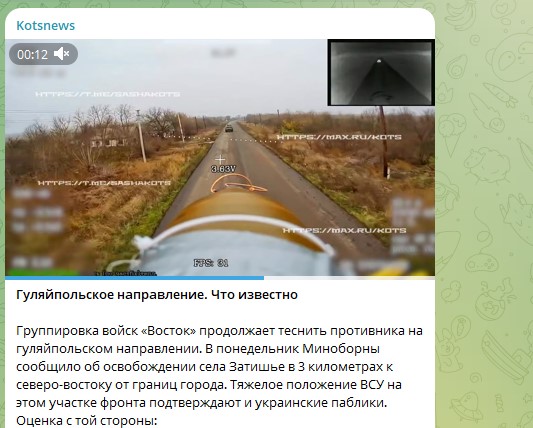 Тем временем военный корреспондент "Комсомольской правды" Александр Коц сообщил последние вести с Гуляйпольского направления. По его данным, группировка войск "Восток" продолжает теснить здесь противника. В понедельник Минобороны сообщило об освобождении села Затишье в трёх километрах к северо-востоку от границ города. Тяжёлое положение ВСУ на этом участке фронта подтверждают и украинские паблики. Вот что пишут на "той" стороне:
