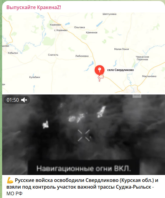 Так, например, стало известно, что после освобождения Свердликово, которое является стратегическим населённым пунктом на пути освобождения Суджи, под контроль была взята трасса Суджа - Рыльск. Точнее, один из ключевых её участков.