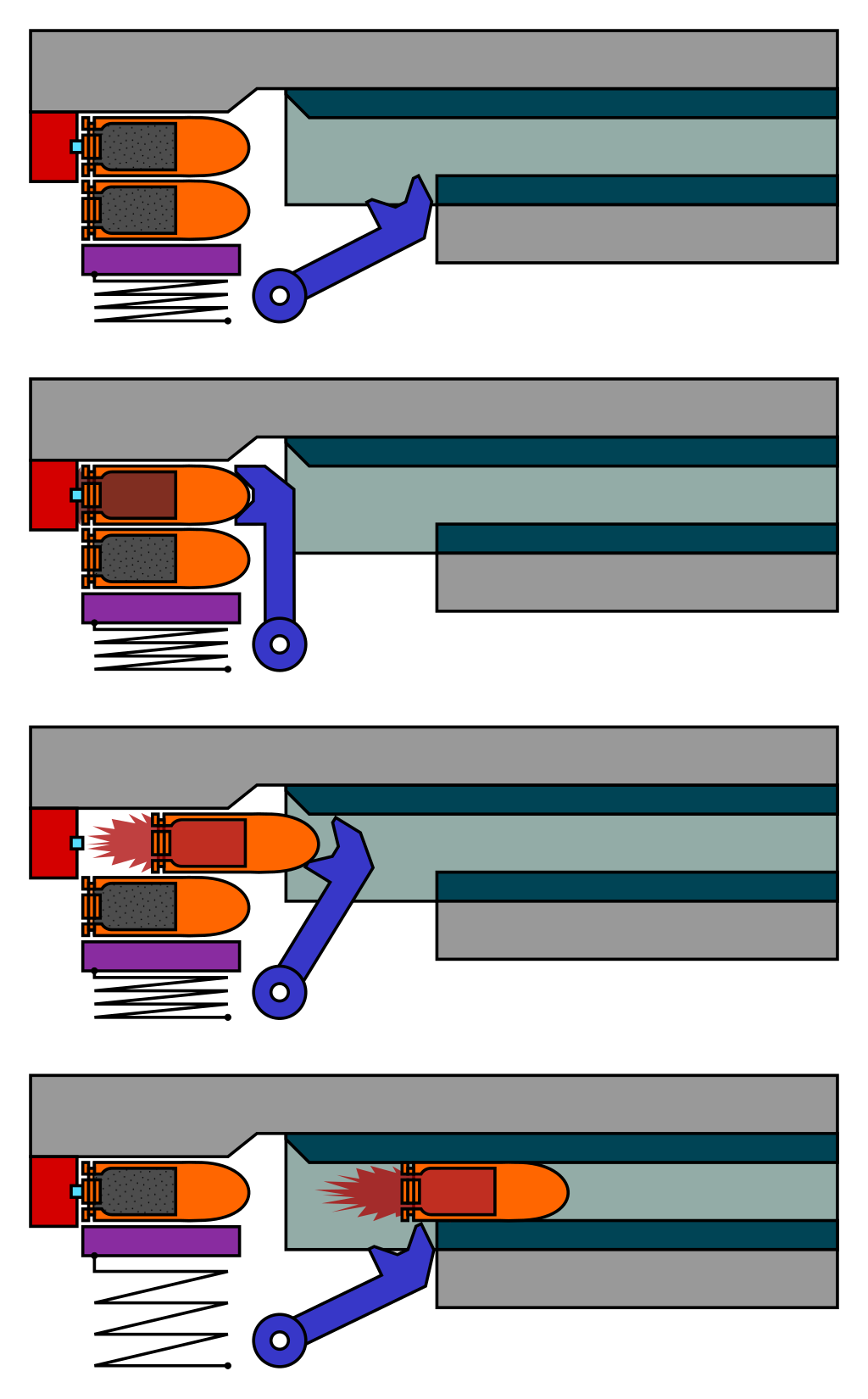 Принцип работы оружия был уникальным. При нажатии на спусковой крючок ударник бил не по капсюлю, а по передней части патрона, толкая его назад на боёк, который воспламенял заряд. После этого мини-ракета начинала разгон прямо в стволе, а максимальную скорость набирала уже в воздухе.