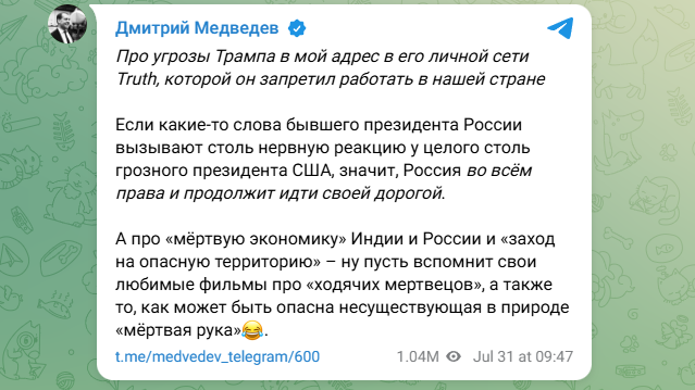 Какое-то время после заявлений Трампа о пошлинах, об изменении отношения к России всевозможные мамкины конспирологи и политологи выдвигали версии о том, что это некая игра Трампа, в том числе по договорённости с российской стороной, для того чтобы реализовать некий очередной хитрый план. Нервные перепалки как раз означают, что нет никакого хитрого плана и отношения действительно обострились, и заявление Трампа соответствует тому, что Трамп по поводу этого процесса думает. В данном случае это симптом достаточно показательный,