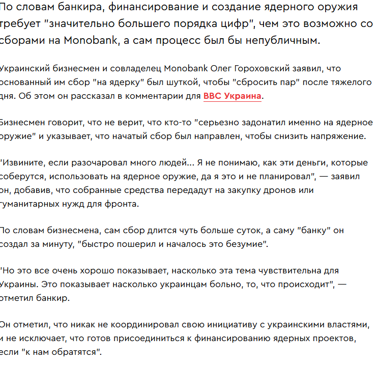 В интервью одному из украинских изданий Гороховский заявил, что не думает, что хоть кто-то "серьёзно задонатил именно на ядерное оружие". Мол, деньги он собирал только ради того, чтобы снизить напряжение в обществе. Но если вдруг что, то он готов "присоединиться к финансированию ядерных проектов", если к нему обратится правительство Украины.