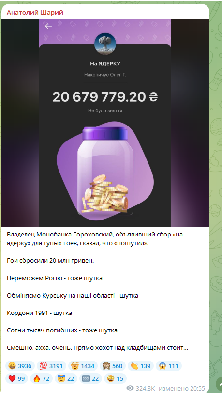 Украинский блогер Анатолий Шарий, давно покинувший Родину и обосновавшийся в Испании, тоже по достоинству оценил банкирский юмор. Бывших соотечественников, радостно бросившихся скидывать деньги на ядерное оружие, он без лишних сантиментов назвал "тупыми".