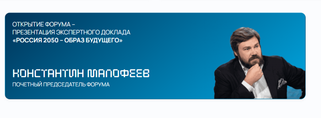 Конференцию откроет презентация экспертного доклада "Россия-2050. Образ будущего" от Почётного председателя форума Константина Малофеева, учредителя канала Царьград.