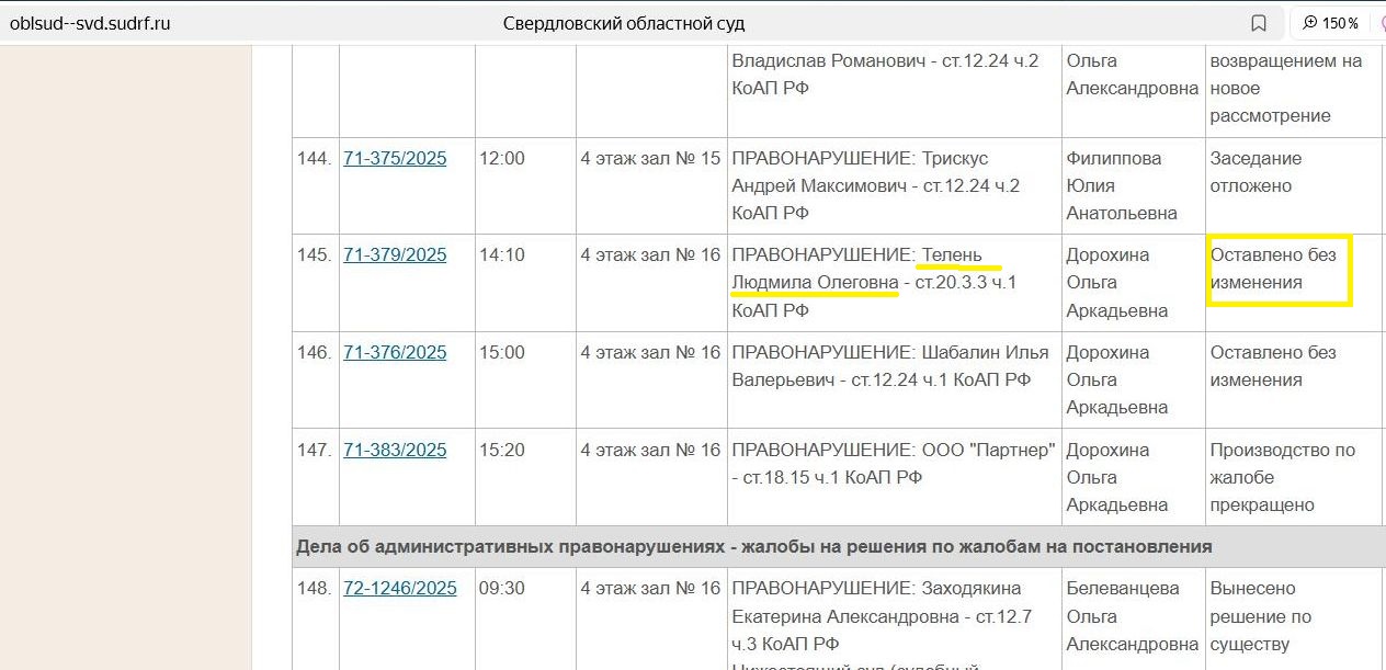 Скриншот: официальный сайт Свердловского областного суда (интернет-сайт oblsud--svd.sudrf.ru)
