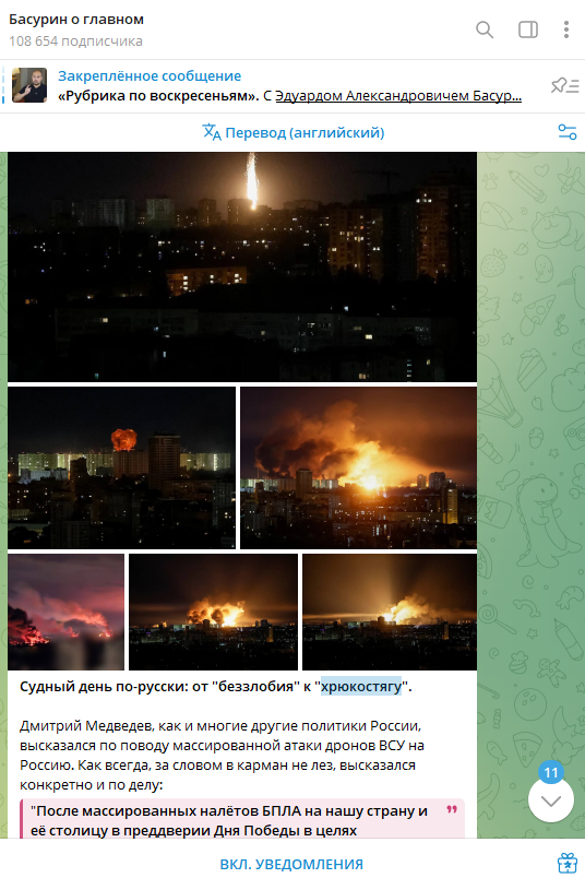 Второе - Медведев и правда связал наш массированный удар с лютыми ошибками Киева и кураторов. И с подготовкой терактов перед Днём Победы, и с 500 беспилотниками, бившими по гражданским объектам в России.