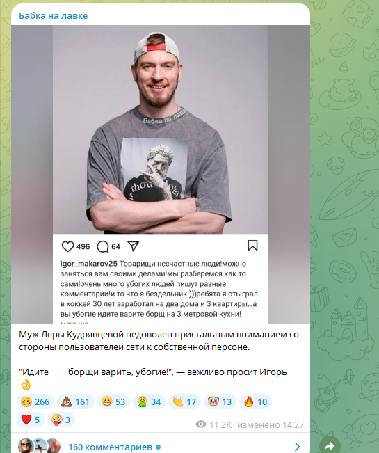 Достоянием общественности внезапно стали семейные проблемы известной телеведущей Леры Кудрявцевой. Оказалось, её брак со спортсменом Игорем Макаровым трещит по швам, в том числе из-за пагубного пристрастия последнего к спиртному. Фанаты Леры после её рассказа пошли в соцсети Игоря, призывая мужчину к порядку. Однако он надменно обругал пользователей: "Идите варите борщ на трёхметровой кухне".