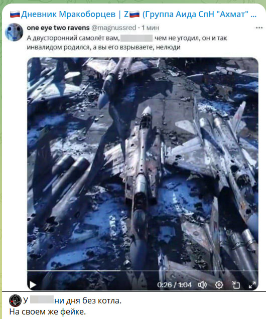 Очередной пример - видео, разлетающееся по немецкому и англоязычным сегментам Twitter, на котором якобы показаны уничтоженные истребители МиГ-29 или МиГ-31. <…> Разумеется, это очередная нейросетевая поделка, собранная за пару минут на коленке: искажения перспективы, артефакты текстур, отсутствие нормальной физики корпусов и многое другое. Большинство пользователей, особенно в профильных кругах, это видят сразу. Но у такого контента другая цель - не убедить специалистов, а бить по поверхностному восприятию: создать ощущение, что "Россия теряет контроль" и "удары успешны",