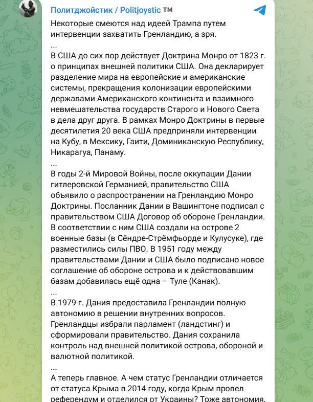 Баширов говорит: Гренландия, по сути, ничем не отличается от Крыма, там точно так же могут провести референдум и отделиться, чтобы войти в состав другого государства.
