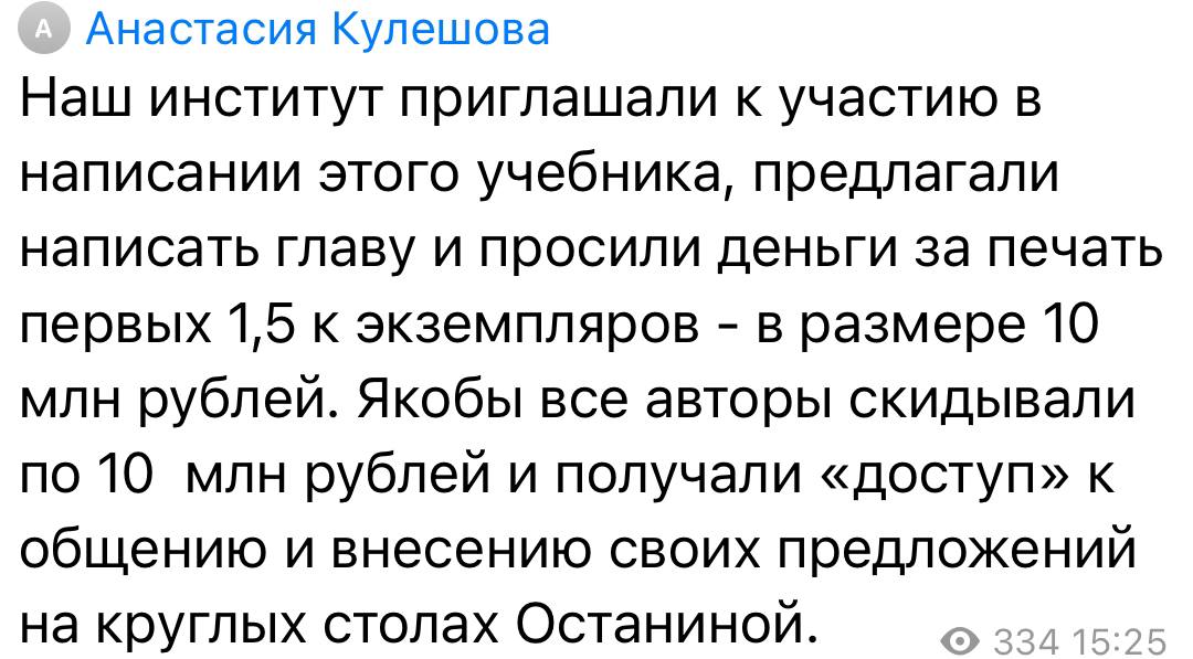 Крестина Сергеева из Ассоциации онлайн-образования предложила мне и Елене Реуновой поучаствовать в создании учебника. Сказала, что учебник официальный, под руководством Останиной и нас приглашают как сильных экспертов [...] Со слов Крестины Сергеевой мы поняли, что деньги пойдут на печать учебников, и рады были принять участие в помощи издания. Стоимость печати, которую мы должны были покрыть, была озвучена как 21 миллион рублей, эти деньги мы взяли из скопленных на развитие бизнеса. Договоры и платежные документы у нас на руках. И вот сегодня обнаружила разоблачения в интернете. Оказывается, к со-авторам есть вопросы. Поэтому хочу искренне сказать, что сожалею о своем участии в этом учебнике [...] Требуем исключить нас из числа со-авторов данного издания.