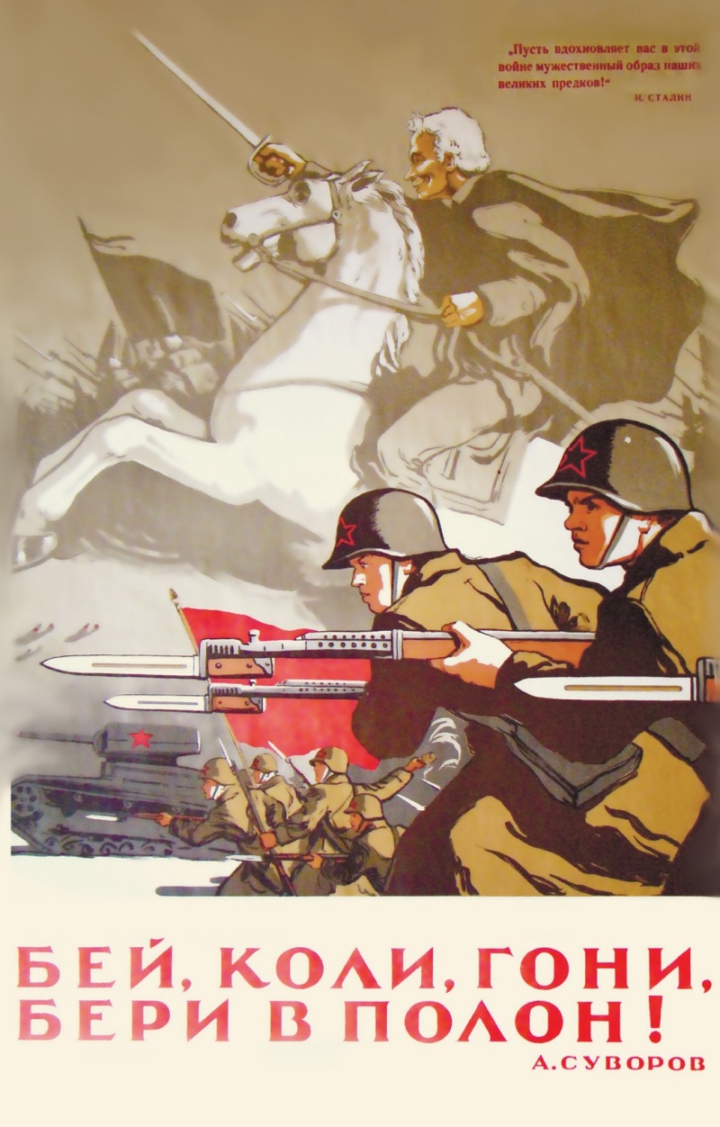 Но когда пришла беда и началась Великая Отечественная война, руководство страны обращается именно к христианским ценностям, к православному духовному наследию. Гонения на Церковь приостанавливаются, начинают популяризироваться образы героев прошлого: святых благоверных князей Александра Невского и Димитрия Донского, праведного адмирала Феодора Ушакова, генералиссимуса Александра Суворова и других подвижников, чей пример самоотверженного служения и любви к Отечеству действительно вдохновлял и продолжает вдохновлять людей,