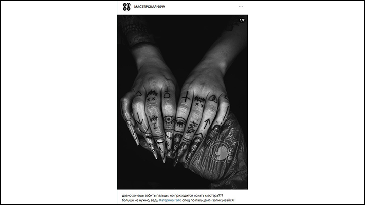 У "Гато" в салоне была своя специализация - татуировки на пальцах. На её странице в ВК можно найти откровения, что она стремится найти "формулу идеального забивания ладоней". Коллеги по салону делали более стандартные вещи: Лера - изображения животных, Инга - "тёмную тематику".