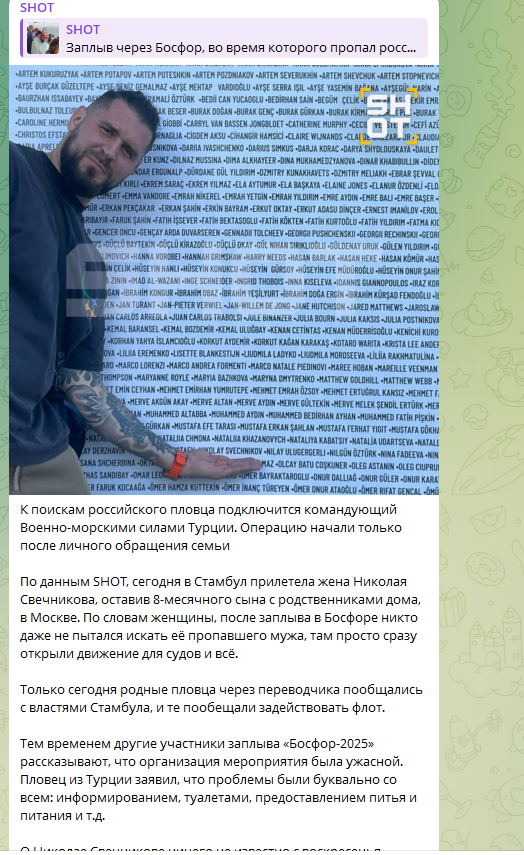 История пропажи в Турции русского пловца Николая Свечникова обрастает всё новыми нехорошими подробностями. Спортсмен, напомним, исчез во время массового заплыва - группа почти в 3 тысячи человек преодолевала Босфор. До финиша Свечников не добрался, но организаторы обнаружили это только спустя 12 часов. Более того, искать пропавшего спортсмена начали только после того, как в прессе поднялась шумиха.