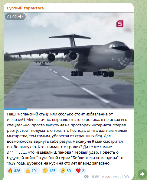 Он также объяснил, что в преддверии великой даты, 9 Мая, всё это смотрится "особо выпукло". Задаваясь вопросом об авторстве ролика, военкор не удержался от грубого ругательства, затем добавив, что ими являются те же неумные люди, которые включили "Первый удар. Повесть о будущей войне" в учебную серию "Библиотека командира".
