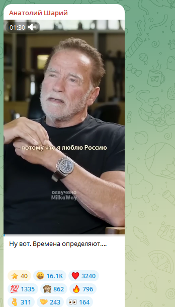 Актёр и бывший губернатор Калифорнии Арнольд Шварценеггер пополнил ряды "переобувшихся" звёзд, которые внезапно воспылали любовью к нашей стране. Как-то странно эта перемена совпала с резким потеплением отношений между Вашингтоном и Москвой. И вот "железный Арни" уже проникновенно говорит: "Я люблю Россию". А каких-то пару лет назад он рвался рассказать "правду о войне" и уверял, что никаких неонацистов на Украине нет, а Кремль начал СВО ради "завоевания".