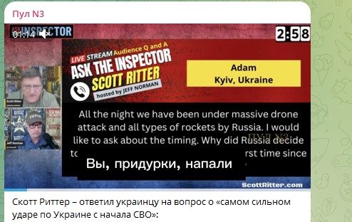 В прямом эфире Скотт Риттер, фактически, ответил на извечный украинский вопрос: "А нас за що?" В частности, киевлянин Адам спросил у американского разведчика, мол, как он смотрит на то, что Россия нанесла по объектам в Киеве один из мощнейших ударов за время СВО. Ответ был неожиданным для многих украинцев: