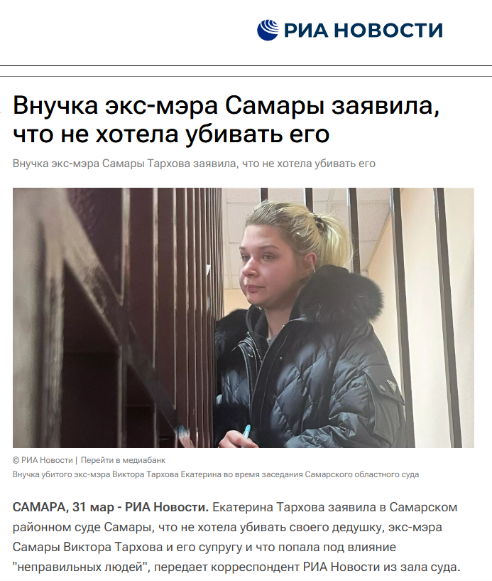 В понедельник, 31 марта, суд Самарского района продлил арест Екатерины Тарховой, обвиняемой в убийстве бабушки и дедушки (бывшего мэра Самары), до 2 июня. Во время заседания она жаловалась на плохое состояние, боли в сердце: "Я не хотела убивать". По словам врача-нарколога, все эти рыдания и жалобы могут быть не раскаянием, а банальной наркотической ломкой. Тархова заявила о "дурном влиянии". Внезапно всплыл некий "Дмитрий из Грузии", а также "целитель-иноагент".