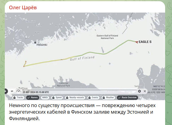 Первый пример - Финляндия. Тамошние власти долго утверждали, что повреждение кабелей между Хельсинки и Таллином - "российская диверсия". Но окружной суд Хельсинки неожиданно заявил: у него нет юрисдикции рассматривать уголовное дело в отношении экипажа танкера Eagle S. Напомним, судно под флагом Островов Кука с русскими нефтепродуктами на борту в декабре 2024 года якорем повредило один энергетический и четыре телекоммуникационных кабеля.
