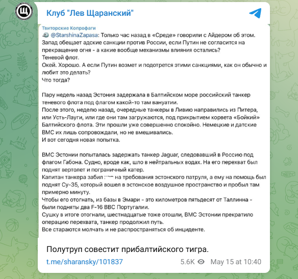 Напомним, на днях в Финском заливе произошёл показательный инцидент. Эстонские военные решили захватить танкер, который следовал в русский Приморск. До этого им уже удалось захватить один, на борту которого был иностранный экипаж.