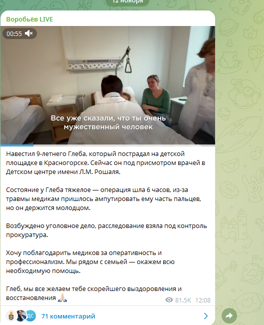 Врачи ранее отмечали, что состояние мальчика, несмотря на то что он бодрится и разговаривает, тяжёлое. Воробьёв подивился тому, как мужественно и стойко ребёнок переносит произошедшее с ним.