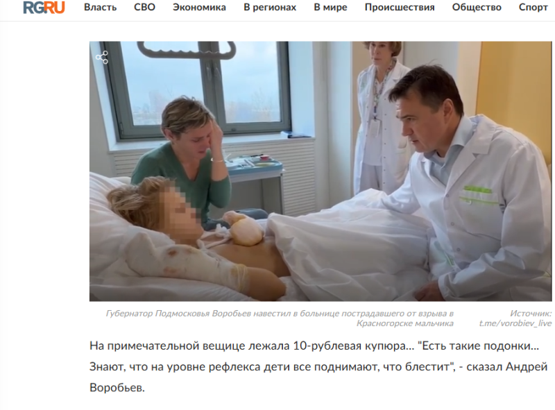 Навестить мальчика, при котором неотлучно дежурит его мама (представить страшно, что пережила женщина), пришёл губернатор Московской области Андрей Воробьёв. На опубликованных им кадрах видно, что у школьника забинтованы обе руки.