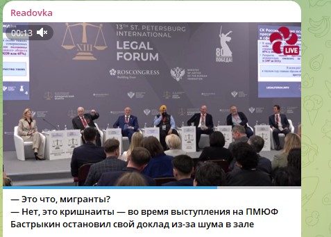 Речь идёт о кадрах с ПМЮФ, где председатель Следственного комитета Александр Бастрыкин выступил с докладом. Во время выступления в части, где была затронута тема мигрантов, присутствующие, в том числе и сам спикер, услышали какой-то шум в дальнем углу зала. Бастрыкин остановил выступление и спросил: "Это что, мигранты?" После этого вопроса гости мероприятия начали громко смеяться. Главе Следкома ответили, что это кришнаиты. При этом Бастрыкин на всякий случая уточнил, не мигранты ли они. Зал захохотал во второй раз.