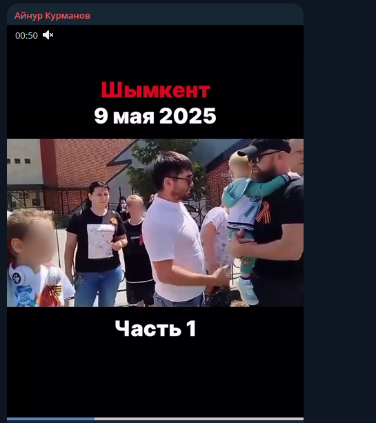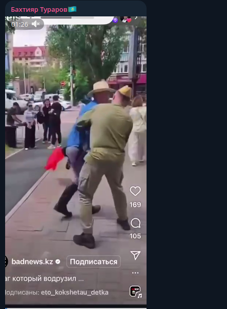 В Шымкенте был зафиксирован случай прямого нападения. На видео, опубликованном казахстанским политиком Айнуром Курмановым, видно, как мужчина попытался сорвать с прохожего Георгиевскую ленту.
