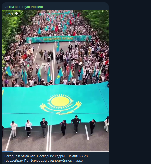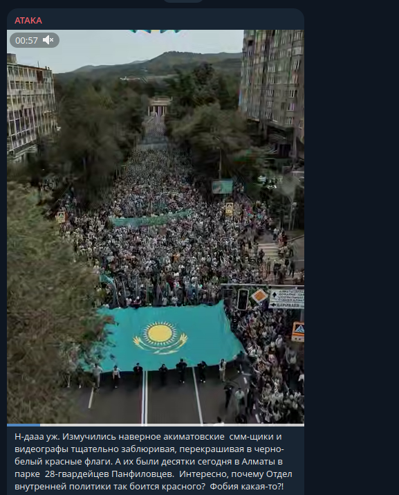 В Алматы же пользователи Сети обратили внимание на странную "редактуру" официальных видео: красные флаги на записи, опубликованной Акиматом, стали чёрно-белыми. Блогер Анастасия Ахметова недоумевает: