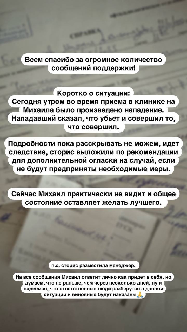 Она добавила, что через несколько дней Михаил Большаков лично расскажет все подробности случившегося. Также менеджер выразила надежду, что правоохранительные органы привлекут нападавшего к ответственности.