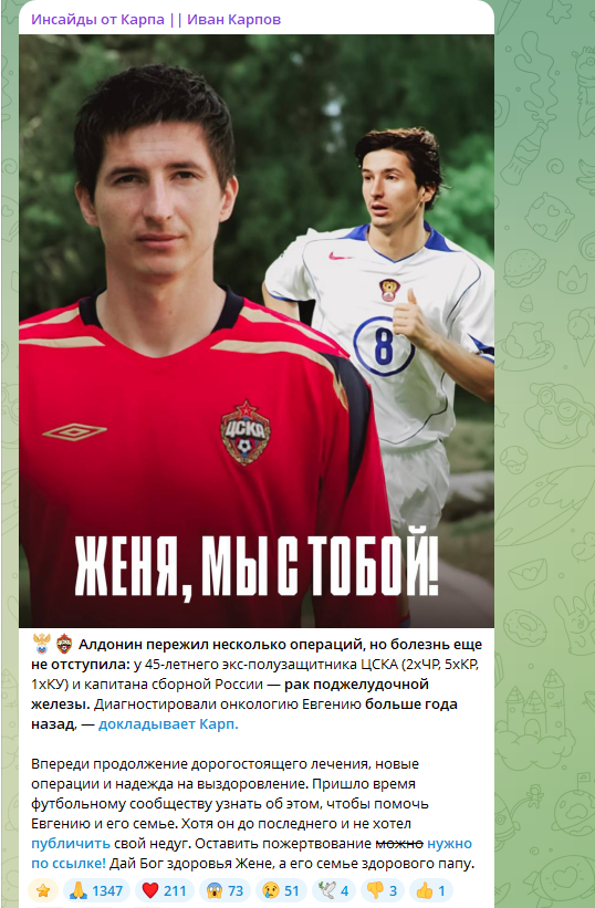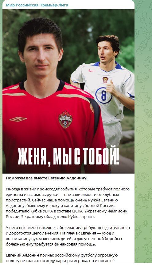 В телеграм-канале Российской премьер-лиги (РПЛ) объявили, что открыли сбор средств на лечение Алдонина.