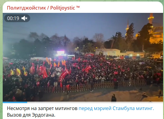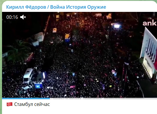 Выход тысяч турок в этот вечер показателен, но не критичен. Это особенность менталитета - принимать участие в таких шествиях. Критично будет, если в воскресенье соберётся не меньше. А если больше - то у Эрдогана будут большие проблемы. Арестованный мэр Стамбула считается проамериканским политиком, и Трамп может включиться против Эрдогана, указывая на митинги с многотысячным участием обычных турок в разных городах.