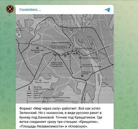 Формат "Мир через силу" работает. Всё, как хотел Зеленский. Но с нюансом в виде русских ракет в бункер под Банковой. Точнее, под Крещатиком. Где ветка соединяет сразу три станции: "Крещатик", "Площадь Независимости" и "Кловскую". На схеме хорошо виден центр Киева и подписаны бункеры,