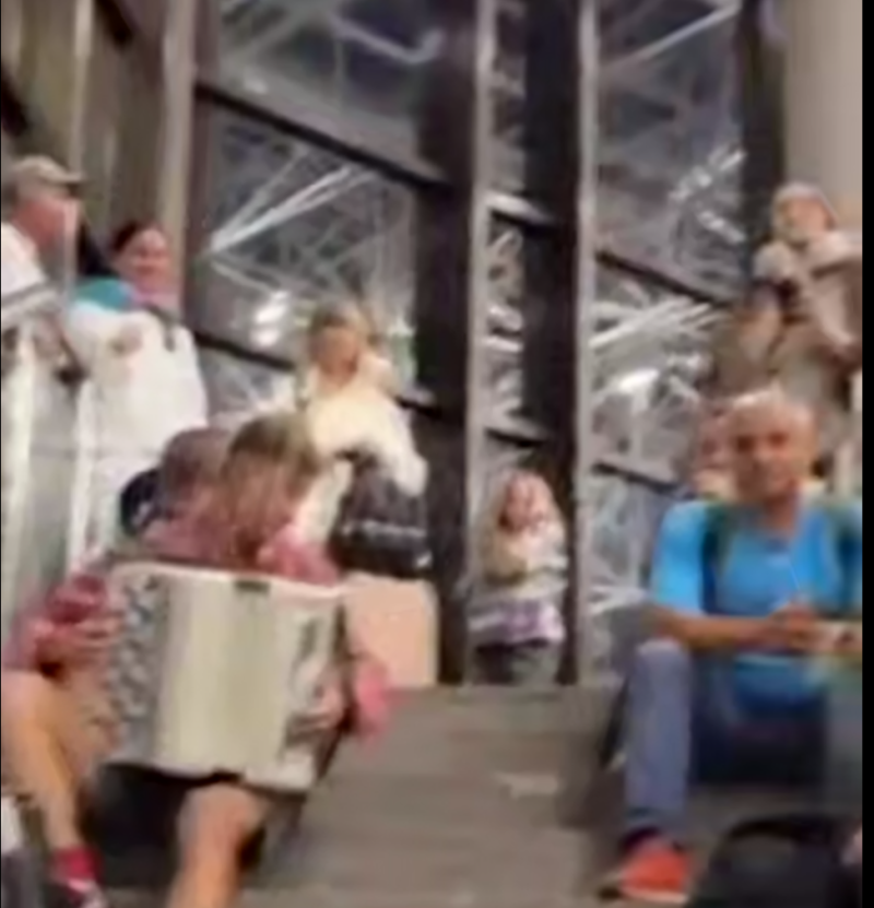 Один из путешественников, который перевозил с собой баян, достал музыкальный инструмент, сел на ступеньки лестницы и начал играть песню друзей из советского мультфильма "Бременские музыканты". Знакомая каждому с детства песня развеяла тревоги, и в итоге весь аэропорт начал подпевать певцу, забыв о неудобствах и волнениях. Это стало народным ответом на террористическую деятельность киевского режима.