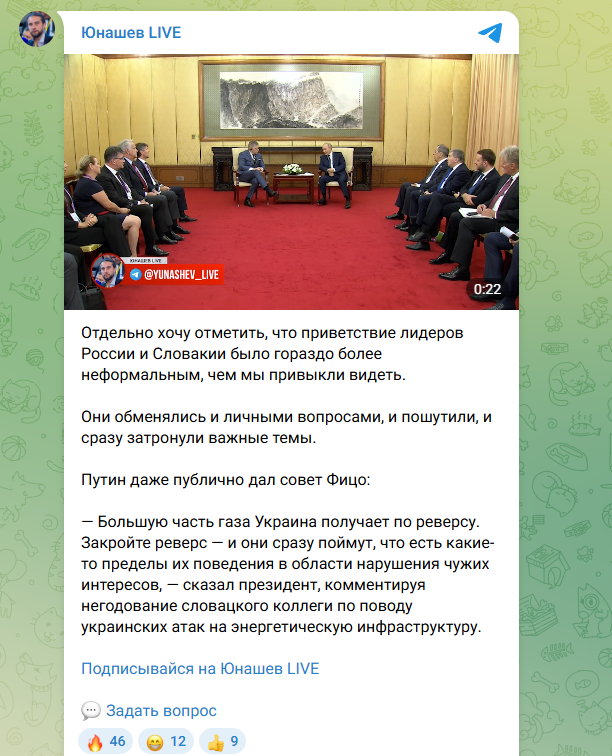 Владимир Путин в Китае встретился с премьер-министром Словакии Робертом Фицо. И с ходу подсказал тому, как дать Киеву по зубам за преступные атаки на нефтепровод "Дружба". Да ещё во всеуслышание - чтобы на Украине все причастные узнали и этими самыми зубами заскрежетали. Совет был простой и эффективный: перекрыть для киевского режима возможность получать газ по реверсу.