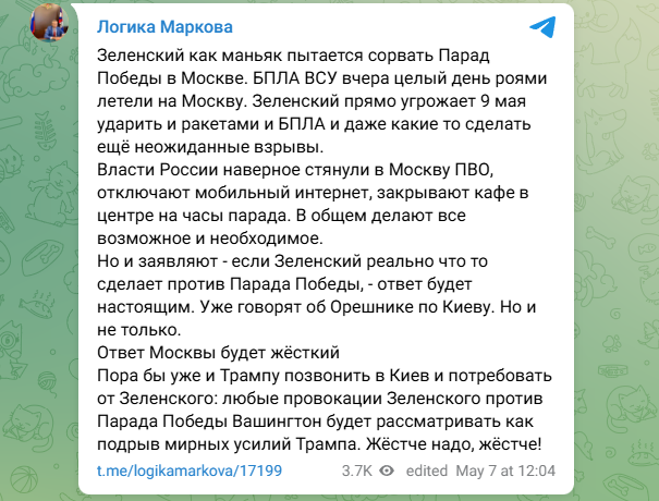 Потребовать от Зеленского: любые провокации против Парада Победы Вашингтон будет рассматривать как подрыв мирных усилий Трампа. Жёстче надо, жёстче!