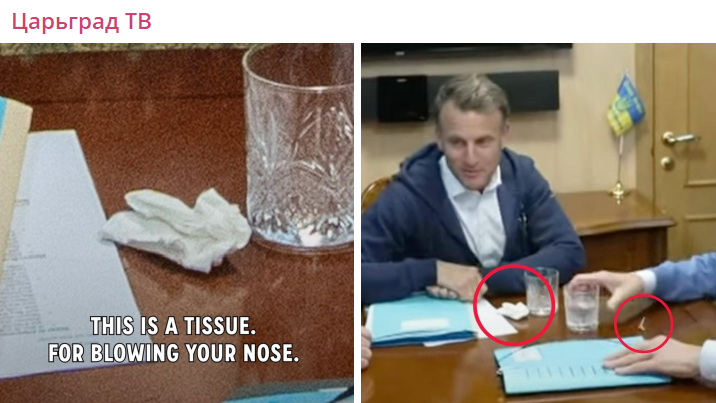 Интрига с одеждой Зеленского появилась после того, как президент Франции Макрон подвергся фальшивым обвинениям в интернете, когда сторонники России обвинили его в том, что он скрывал мешочек с белым порошком во время поездки в Украину.