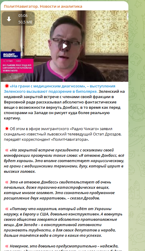 Особенно его взбесило то, что для Америки и Европы киевский режим транслирует другие нарративы. Куда более приближенные к реальности. А внутреннему потребителю предлагают несуразную ложь.