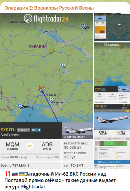 Намёк? Хотя скорее всего, результат какого-то глушения и/или подделки. Трекер FlightRadar24 показал Ил-62М ВКС России, пролетавший на юго-запад над Центральной Украиной после вылета из Москвы,