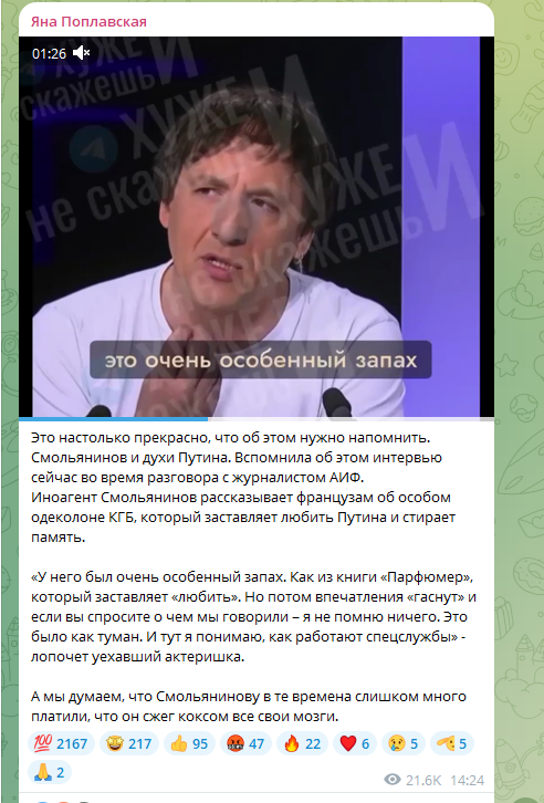 Беглый актёр Артур Смольянинов* на полном серьёзе рассказывает за рубежом, что когда-то КГБ заставило его… любить Путина. Нет, это не шутка, а реальное заявление. Смольянинов вещает изумлённой иностранной публике - мол, дают понюхать специальные "духи". Затянул носом особое вещество и давай изо всех сил любить президента!..