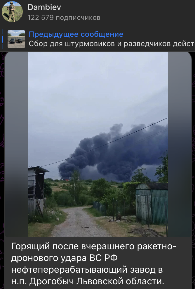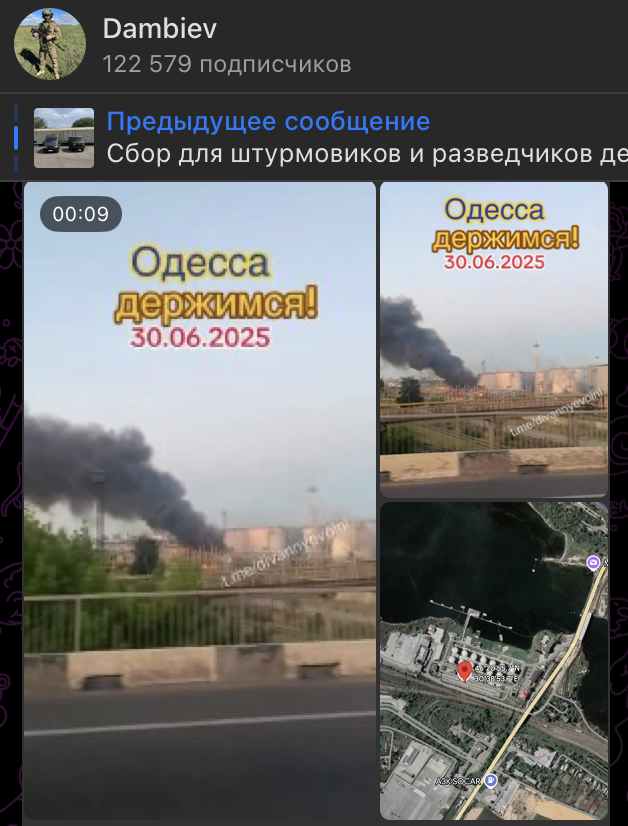 На днях было громко и в Одессе. В местных каналах пишут о пожаре, воздух пропитался едким запахом краски и газа. 30 июня русские военкоры писали, что дрон-камикадзе "Герань-2" ударил по НПЗ в н.п Бурлачья Балка, что в Одесской области.