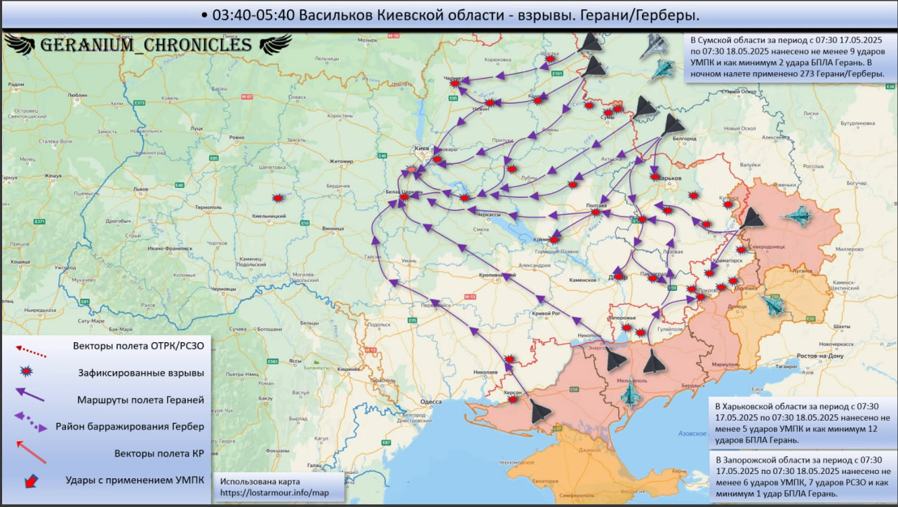 Массированные удары активно наносятся по Киеву и области, в том числе по местам дислокации очень важных шишек. В ночь на 18 мая там вовсе был ад - за ночь ВС России запустили почти 300 БПЛА, писали украинские СМИ со ссылкой на разведку и ВВС, что стало самой мощной атакой с начала СВО, отметил runews24.ru. Значительная часть прилётов пришлась именно на столичный регион, в частности на аэродром Васильков и военную базу на комбикормовом заводе, где предположительно обитают британские военные. Все цели поражены.