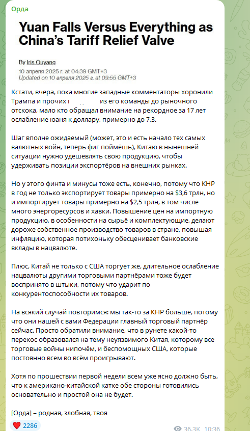 То, что юань упал до уровня 2007 года, позволяет отчасти восстановить позиции китайских экспортёров. И это эскалационный ход, потому что недооценённость юаня являлась одной из претензий со стороны США к Китаю. Это скорее показывает, что Китай пока что настроен серьёзно. Они управляют курсом юаня и они позволяют ему колебаться в узком диапазоне, обычно около целевого уровня,