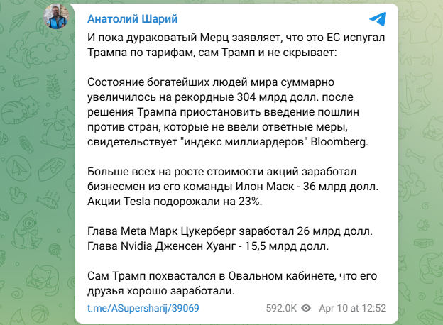 Пока Дональд Трамп радуется и подсчитывает прибыток. Пока в Европе отходят от шока после "тарифного" удара, президент США объявил - после введённых послаблений акции американских компаний взлетели вверх. Они "в плюсе" на десятки миллиардов долларов.