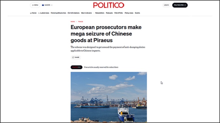 Европейская прокуратура (EPPO) конфисковала 2435 морских контейнеров в крупнейшем порту Греции Пирей, контрольный пакет акций которого принадлежит китайскому государственному предприятию COSCO. Скриншот страницы сайта Politico