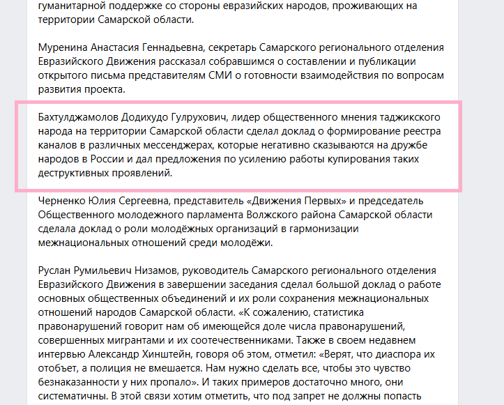 Он рассказал, что глава таджикской диаспоры недавно озвучил интересное предложение. Он хочет создать специальный реестр каналов, действующих в различных мессенджерах, где освещают связанные с мигрантами проблемы. Это, по мнению Бахтулджамолова, негативно сказывается на "межнациональной дружбе".